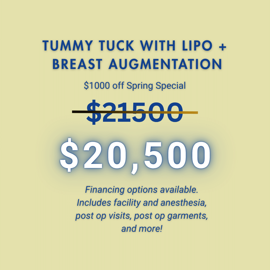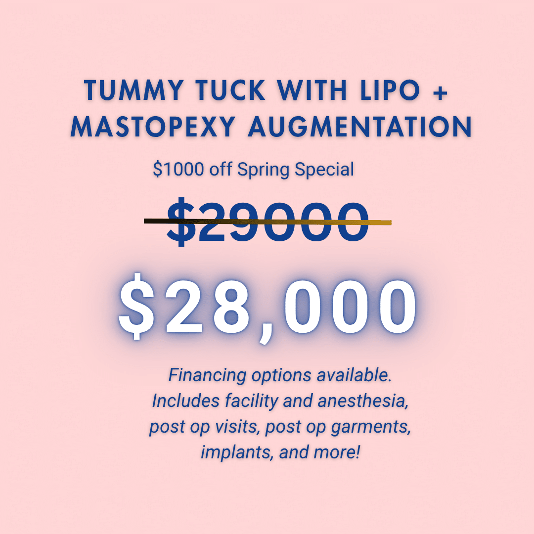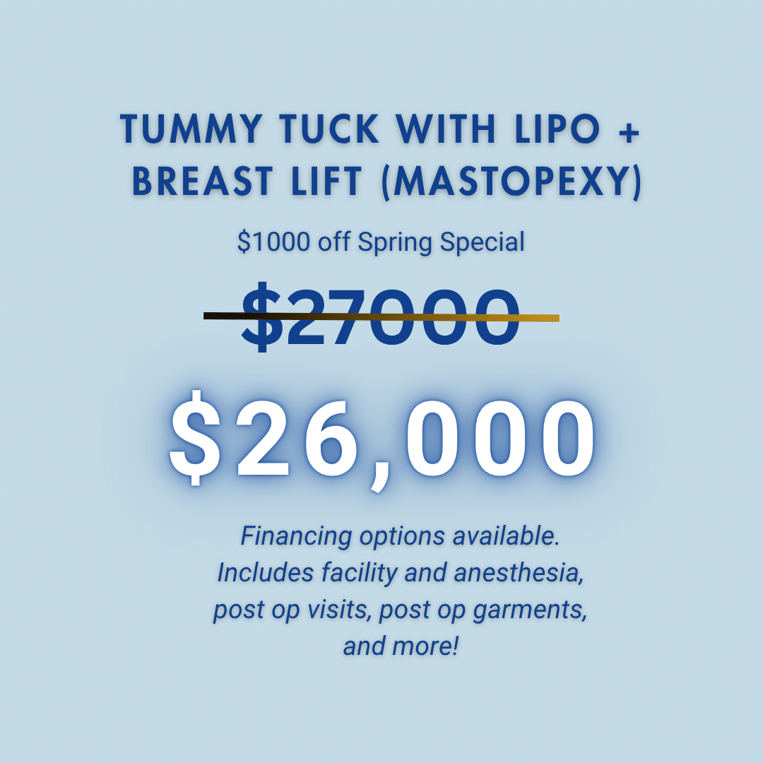 Did you know that mommy makeover combines a tummy tuck and liposuction along with breast augmentation or breast lift to treat multiple areas in a single surgery? This spring take $1000 off your procedure when you combine tummy tuck with breast augmentation or breast lift.